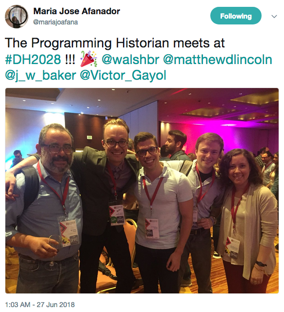 PH Blog The Programming Historian blog is our space to share news about the project, ideas for how you might use technology in your work, and exciting examples of the Programming Historian applied in the real world. Subscribe to the RSS feed for new blog posts. July 13, 2018 Programming Historian French-speaking initiative Anna-Maria Sichani Marie Puren and Sofia Papastamkou have joined the Programming Historian July 9, 2018 The Programming Historian in DH2018 Maria José Afanador-Llach and James Baker Members of the Programming Historian project team at DH2018 June 3, 2018 The Seven More Lessons No One's Yet Written (but need writing) Adam Crymble The Programming Historian Needs YOU...to help historians digitally analyse! May 24, 2018 Anna-Maria Sichani joins Project Team Antonio Rojas Castro Anna-Maria Sichani has joined the Programming Historian May 22, 2018 Uses of the Programming Historian Adam Crymble If you’re looking for inspiration into how you can use the Programming Historian in your work, look no further. We’ve put together a list of some of the examples we’ve come across over the years. We’re sure it’s no where near complete, but it’s great to see the hard work of our authors, reviewers, and team translating into real impact in a range of settings. April 16, 2018 The Programming Historian 2018 Community Survey Anandi Silva Knuppel To participate in Programming Historian 2018 Community Survey, follow this link to a Google Form: https://goo.gl/forms/2M8AbAiwgmGrD7MI3. The survey should take only a few minutes to complete and will close July 15, 2018. April 12, 2018 Convocatoria para taller de Escritura en Humanidades Digitales para América Latina Maria José Afanador-Llach and Adam Crymble The Programming Historian en español invita a la comunidad académica hispanohablante a participar en el taller Escritura en Humanidades Digitales para América Latina que se llevará a cabo en la Universidad de los Andes (Bogotá, Colombia) del 1 al 3 de agosto de 2018. El objetivo del taller es reunir a un grupo diverso de investigadores en distintas áreas de las humanidades para escribir tutoriales sobre metodologías en humanidades digitales, abordando específicamente necesidades de investigación en América Latina y el mundo hispano. Durante el taller se facilitará la producción de los primeros tutoriales originales en español para ser compartidos con una audiencia global. ← 12 / 18 →